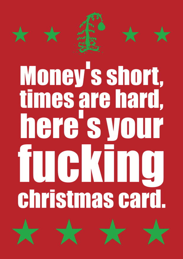 Eine Weihnachtskarte zeigt eine klare Botschaft über finanzielle Sorgen und den Stress, der mit der Weihnachtszeit verbunden ist. Der Schriftzug ist auffällig und direkt.