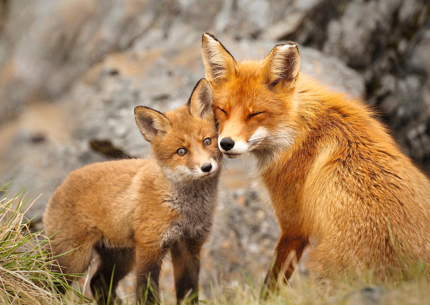 Ein ausgewachsener Fuchs und ein junges Fuchsjunges zeigen Zuneigung zueinander, während sie sich in einer natürlichen Umgebung entspannen. Die Szene strahlt Ruhe aus.