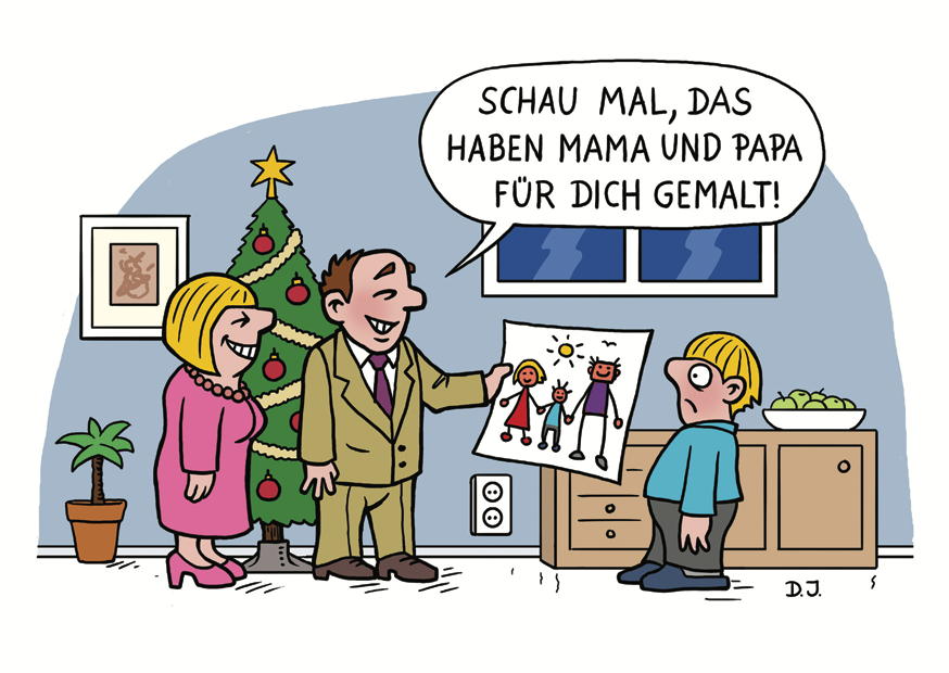 Ein Junge schaut überrascht auf ein gemaltes Bild, das seine Eltern ihm zeigen. Der Weihnachtsbaum im Hintergrund sorgt für eine festliche Atmosphäre.
