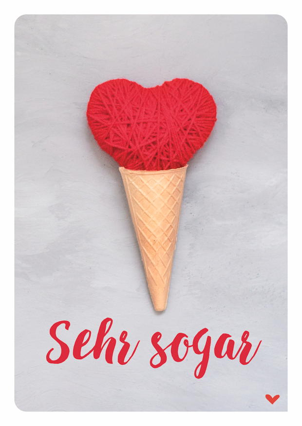 Ein kreatives Arrangement zeigt eine Waffel mit einem roten Herz aus Wolle, das wie ein Eis aussieht. Die Komposition sorgt für einen fröhlichen, lässigen Eindruck.