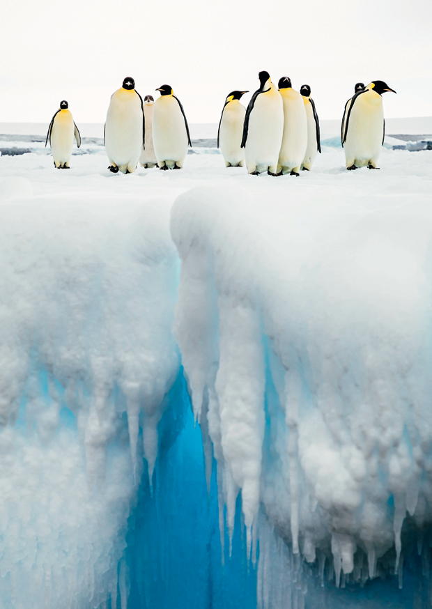 Kaiser-Pinguine versammeln sich auf einer Eisfläche in der Antarktis und blicken auf das kalte, blaue Wasser. Die eisige Umgebung zeigt die raue Schönheit der Natur.