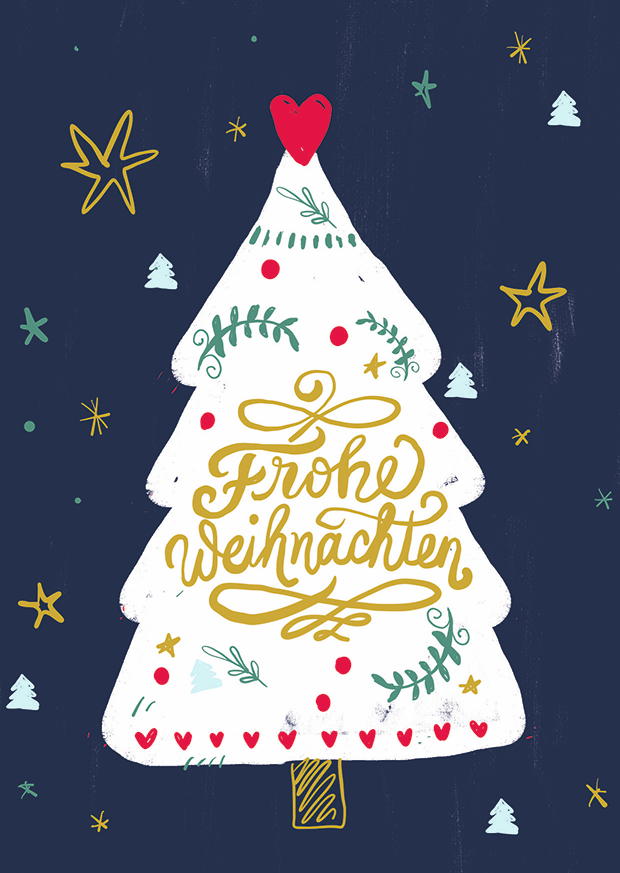 Ein festlicher Weihnachtsbaum in Weiß mit roter Spitze und goldener Schrift auf einem dunklen Hintergrund. Umgeben von Herzen und Sternen, verbreitet er Weihnachtsstimmung.