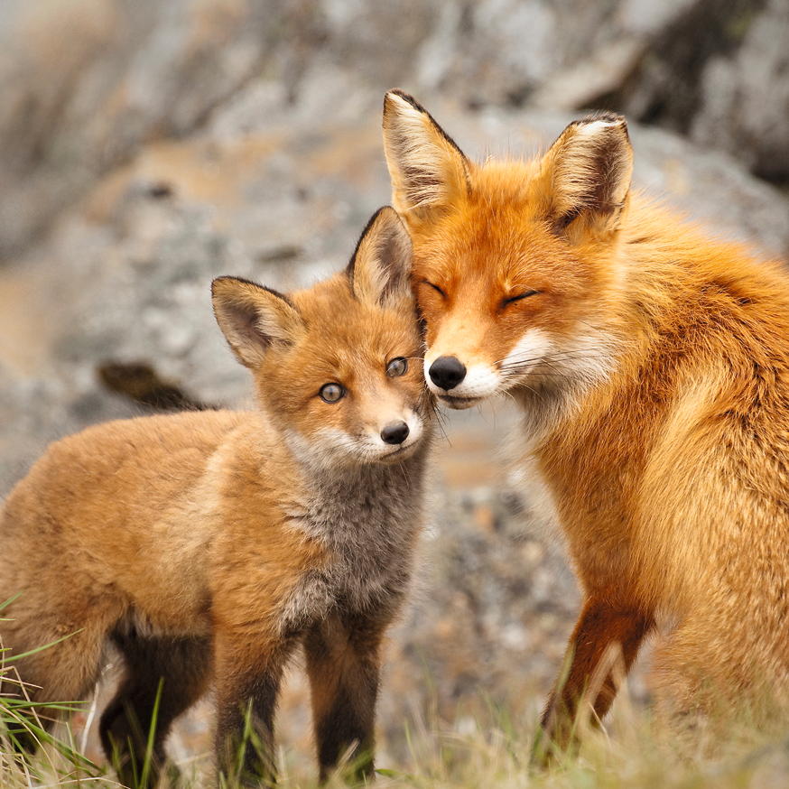 Ein kleiner Fuchs steht neben seiner Mutter und kuschelt sich an sie. Die beiden Tiere ruhen sich in einer natürlichen Umgebung aus, umgeben von Felsen und hohem Gras.