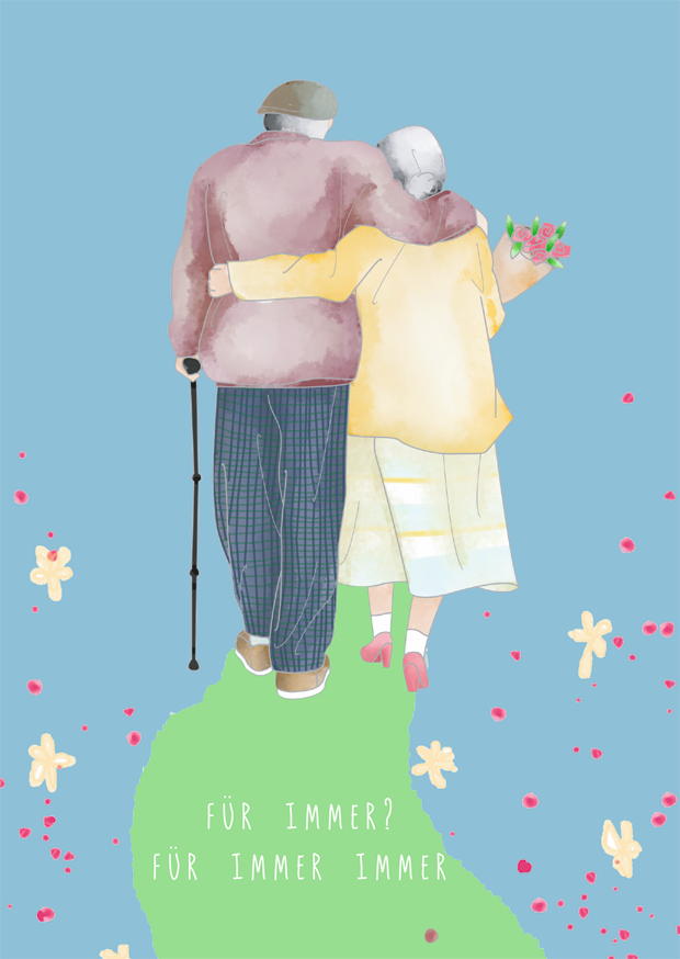 Ein älteres Paar steht eng umschlungen in einem blühenden Garten, die Frau hält einen Blumenstrauß in der Hand. Die fröhliche Atmosphäre spiegelt ihre Zuneigung wider.