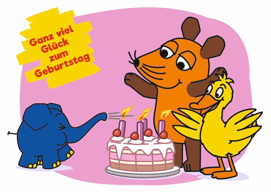Eine Maus, ein Elefant und eine Ente stehen zusammen und feiern einen Geburtstag mit einem mehrstöckigen Kuchen, auf dem Kerzen brennen. Die Stimmung ist heiter.