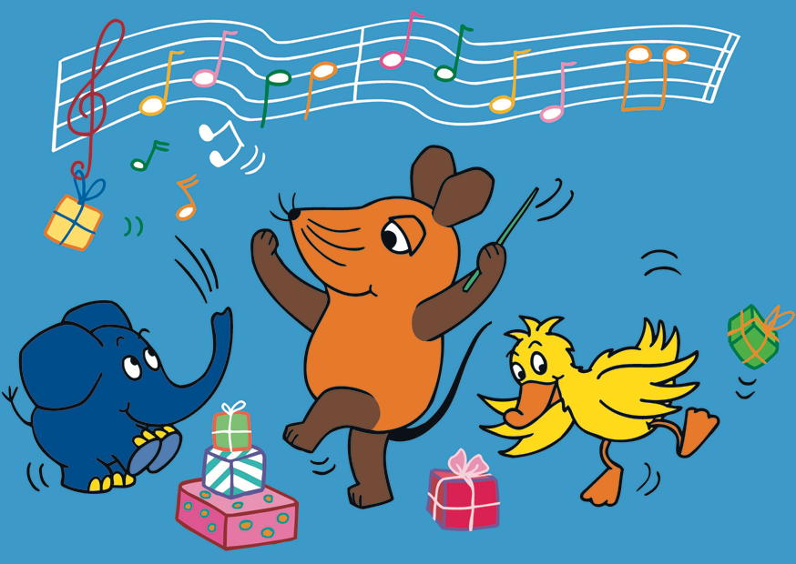Eine fröhliche Maus dirigiert eine bunte Melodie. Der Elefant und die Ente tanzen um Geschenke in einer lebhaften, musikalischen Atmosphäre.