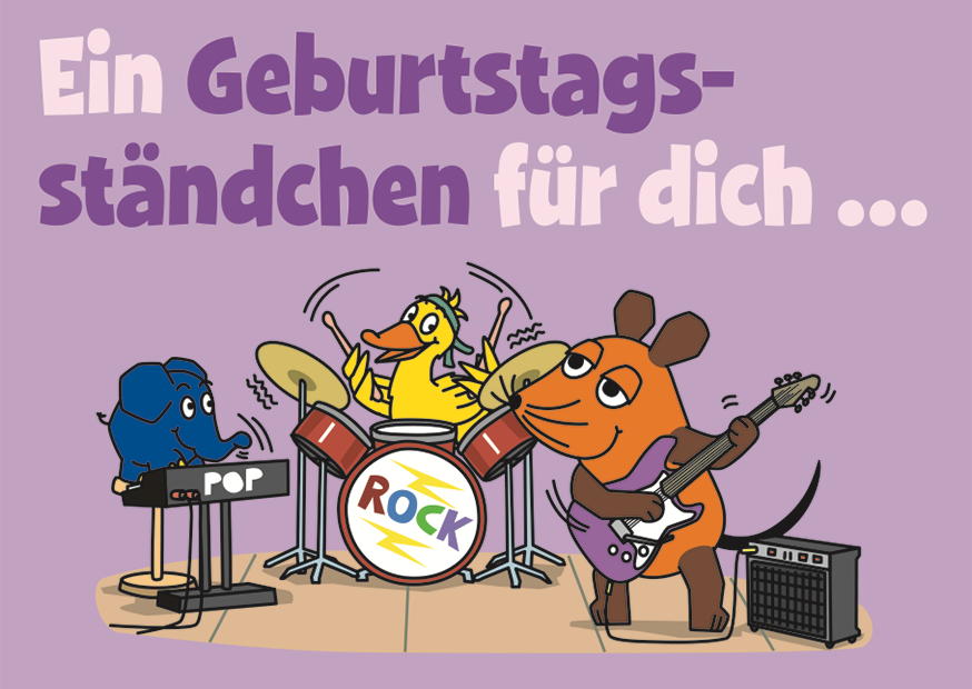 Eine Elefant, eine Gans und eine Maus spielen gemeinsam Musik in einer bunten Umgebung. Die Tierfreunde feiern einen besonderen Geburtstag mit einem fröhlichen Konzert.