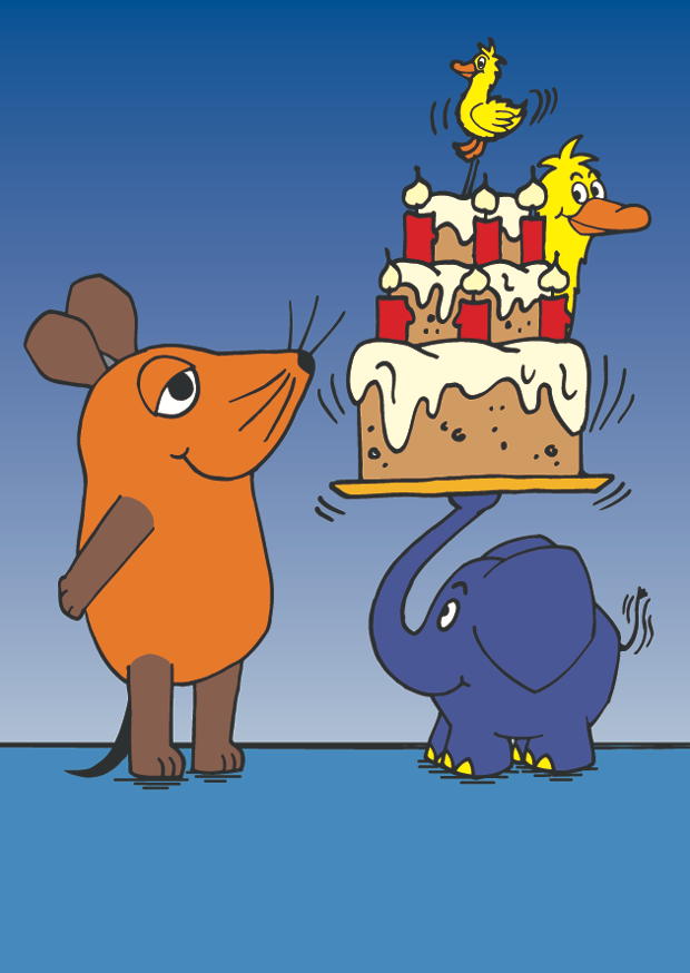 Eine orange Maus und ein blauer Elefant stehen unter einem klaren Himmel und tragen zusammen eine festliche Geburtstagstorte. Auf der Torte balanciert eine gelbe Ente.
