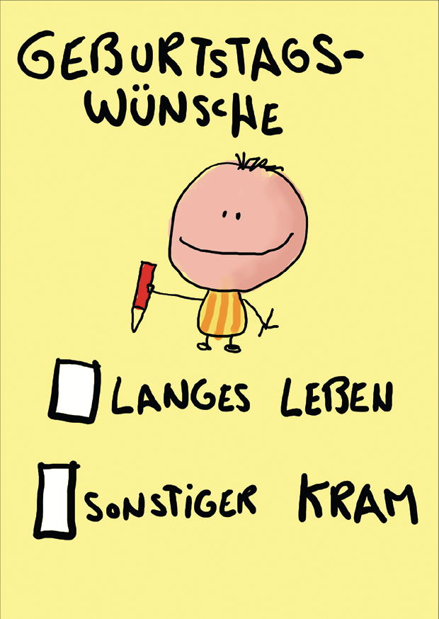 Ein lustiger, gezeichneter Charakter hält einen Stift in der Hand und zeigt humorvolle Geburtstagswünsche. Der Hintergrund ist gelb und kreativ gestaltet.