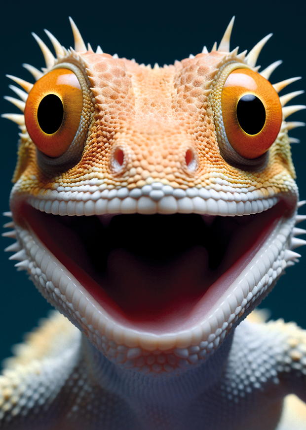 Der Gecko hat große, ausdrucksstarke, orangefarbene Augen und ein breites, fröhliches Maul. Seine Haut ist voller interessanter Texturen und Muster, die ihn lebhaft erscheinen lassen.