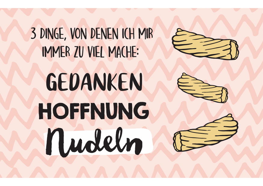 Das kreative Design zeigt drei Begriffe, die auf einem hellen Hintergrund stehen, begleitet von Illustrationen von Nudeln. Es vermittelt eine fröhliche und humorvolle Stimmung.
