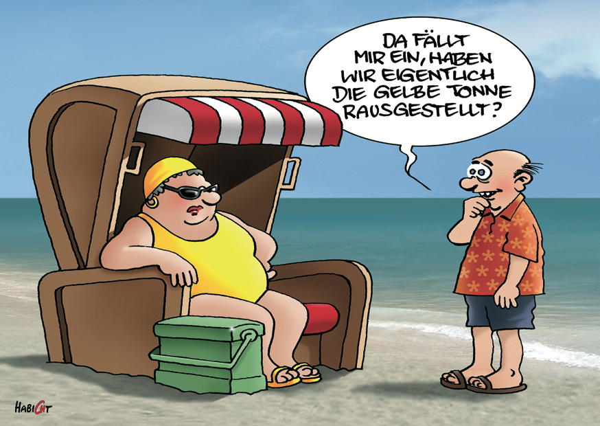 Zwei Männer genießen ihren Urlaub am Strand. Der eine sitzt entspannt mit Sonnenbrille im Liegestuhl, während der andere sich an die gelbe Tonne erinnern möchte..