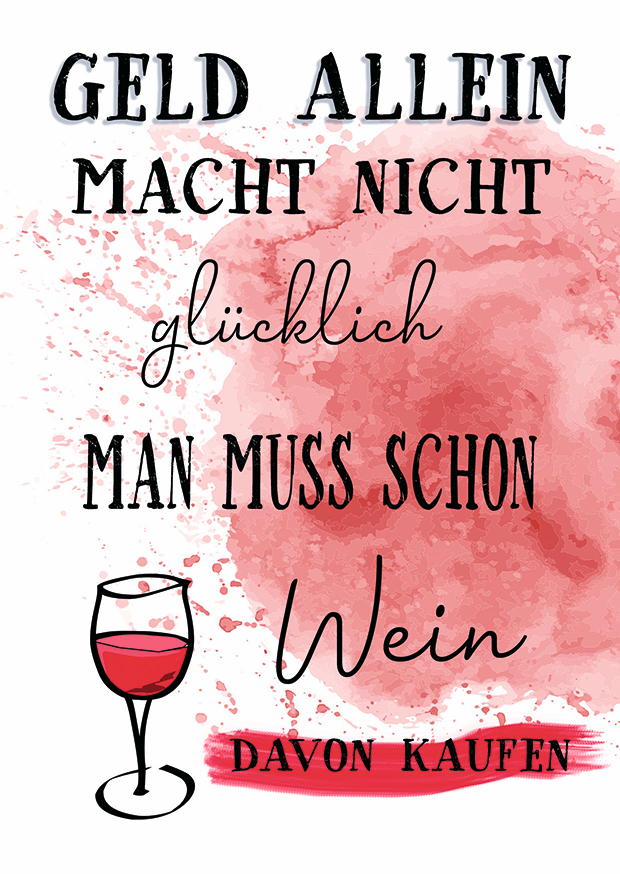 Das Zitat vermittelt auf lustige Weise, dass Geld allein nicht glücklich macht und man auch Wein genießen muss. Der Hintergrund sorgt für eine ansprechende Optik.