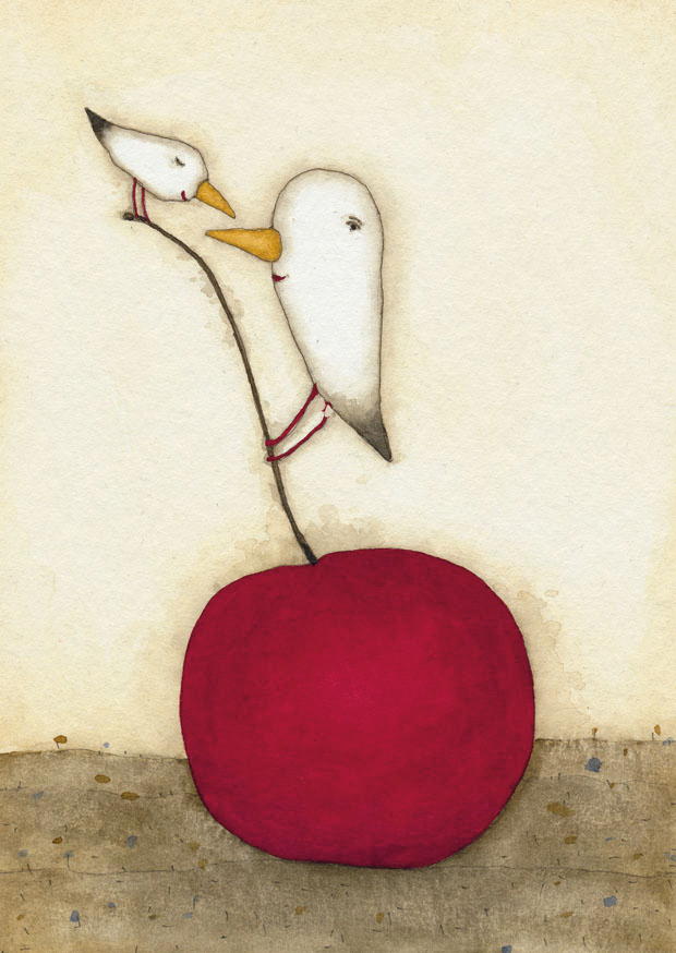 Zwei Vögel stehen auf einem dicken Zweig eines roten Apfels und kommunizieren miteinander, umgeben von einer sanften, neutralen Farbgebung.