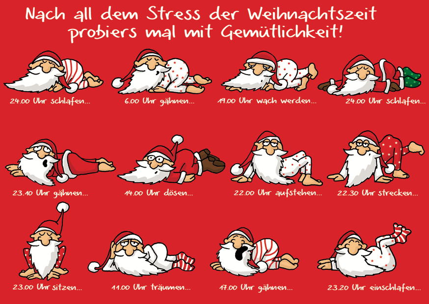 Der Weihnachtsmann liegt in verschiedenen entspannenden Posen auf einem roten Hintergrund. Er schläft, träumt und dehnt sich, während er die ruhige Zeit der Weihnachtszeit genießt.