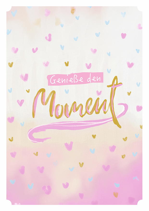 Eine kreative Gestaltung zeigt den Spruch Genieße den Moment auf einem sanften, pastellfarbenen Hintergrund mit bunten Herzen. Ideal für positive Gedanken.