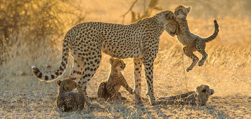 Eine Gepardenmutter liegt im Gras und beobachtet ihre spielenden Jungen. Die Kinder tollen fröhlich herum, während die Sonne langsam untergeht.