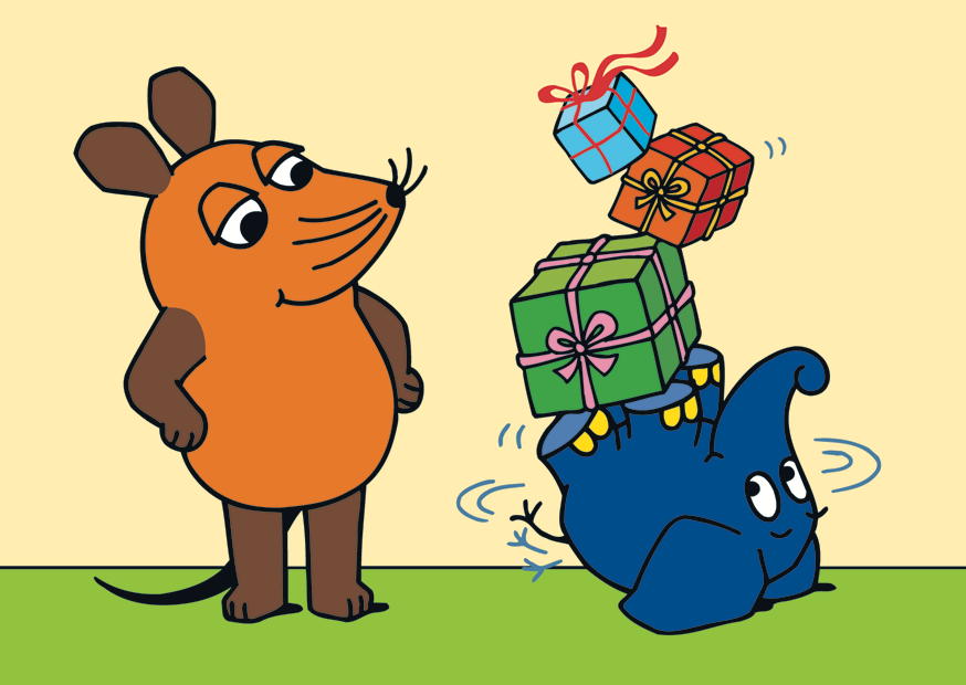 Die Maus und ein fröhlicher Elefant versuchen, Geschenke zu balancieren. Der Elefant steckt hinter einer bunten Geschenkebalde und lächelt.