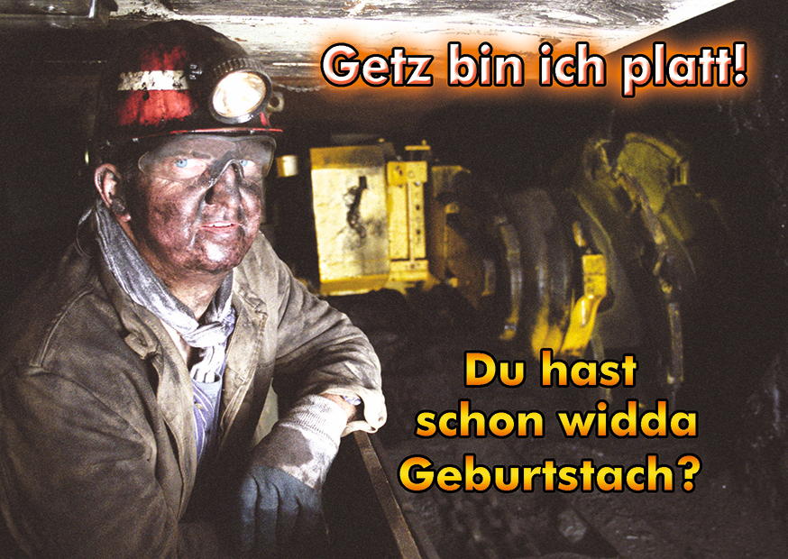 Ein Bergmann, der mit Schaufel und Helm in einem dunklen Stollen arbeitet, fragt humorvoll nach dem nächsten Geburtstag, während er von Kohlenstaub bedeckt ist.