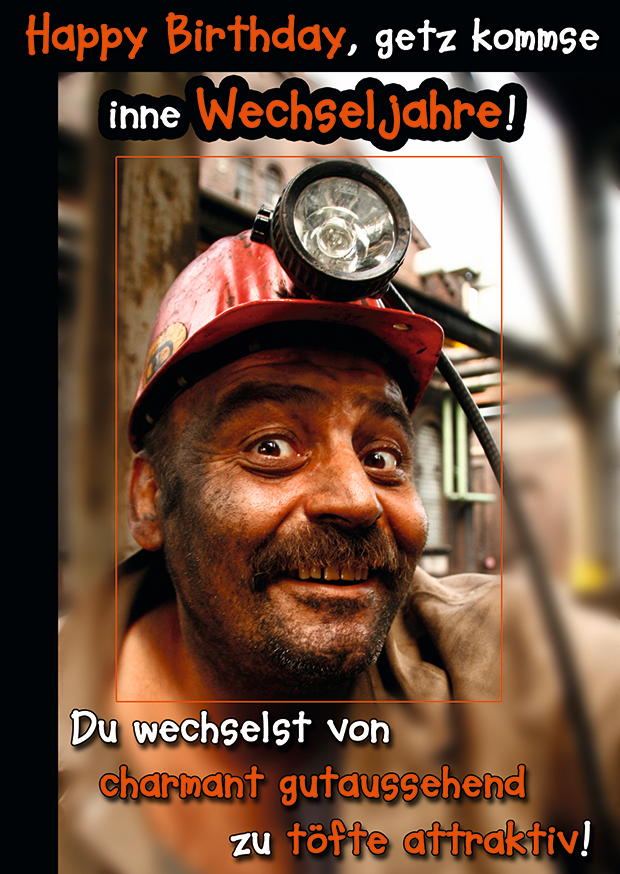Ein Bergarbeiter lächelt breit und strahlt Freude aus, während er an seinem Geburtstag die Wechseljahre feiert. Er trägt einen Helmmütze mit Lampe und wirkt zufrieden.