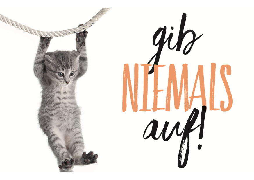 Eine spielerische graue Katze hängt mit ihren Pfoten an einem Seil und motiviert mit der Botschaft, niemals aufzugeben. Das Bild strahlt Freude und Entschlossenheit aus.
