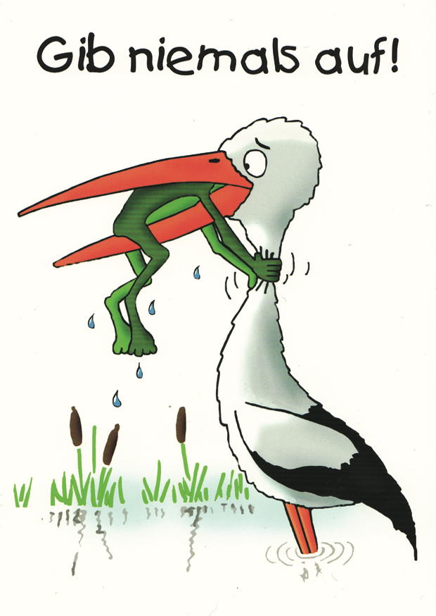 Ein Frosch hängt am Hals eines Storches und scheint sich festzuhalten. Es regnet, während der Storch besorgt aussieht. Die Botschaft ist, niemals aufzugeben.