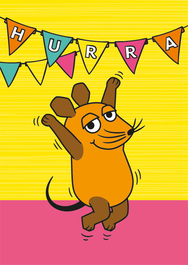 Eine orangefarbene Maus mit großen Ohren tanzt voller Freude unter bunten Fahnen. Die fröhliche Atmosphäre vermittelt eine Feierlaune, während die gelbe Wand erstrahlt.