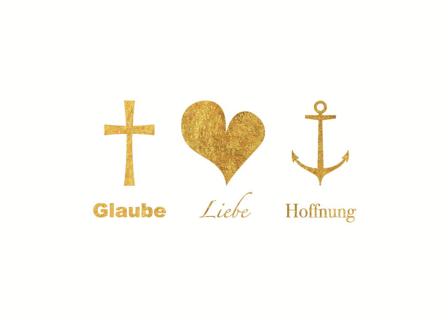 Drei zentrale Symbole des Glaubens sind in goldener Schrift aufhellem Hintergrund abgebildet, die einen positiven Lebensansatz verkörpern.