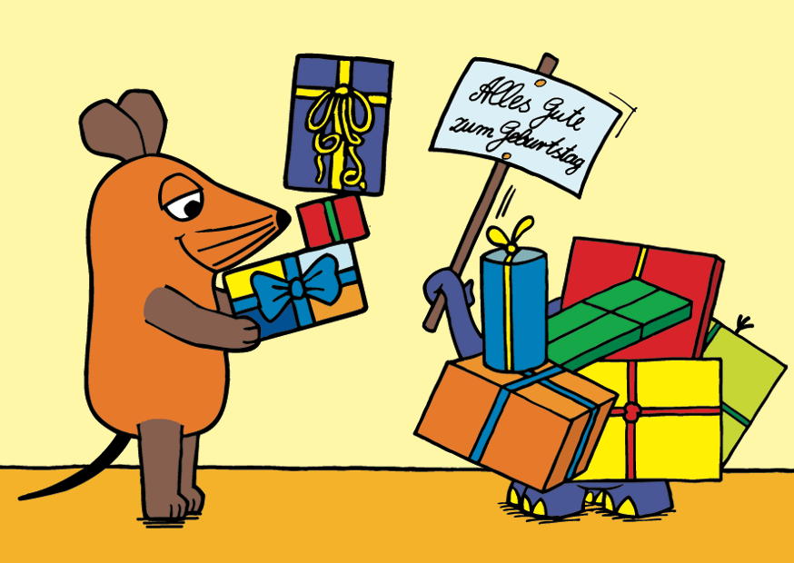 Eine fröhliche Maus überreicht einem Drachen mehrere liebevoll verpackte Geschenke. Der Drache hält ein Schild mit den besten Wünschen für einen Geburtstag.