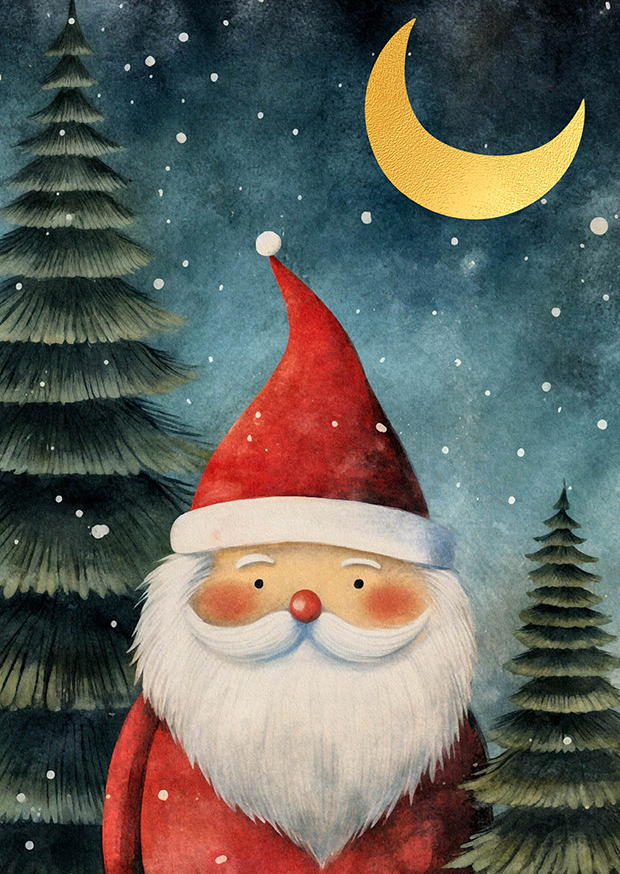 Ein Weihnachtsmann mit rotem Anzug und weißem Bart posiert in einem Winterwald, umgeben von Tannen, während der Mond golden am Himmel leuchtet.