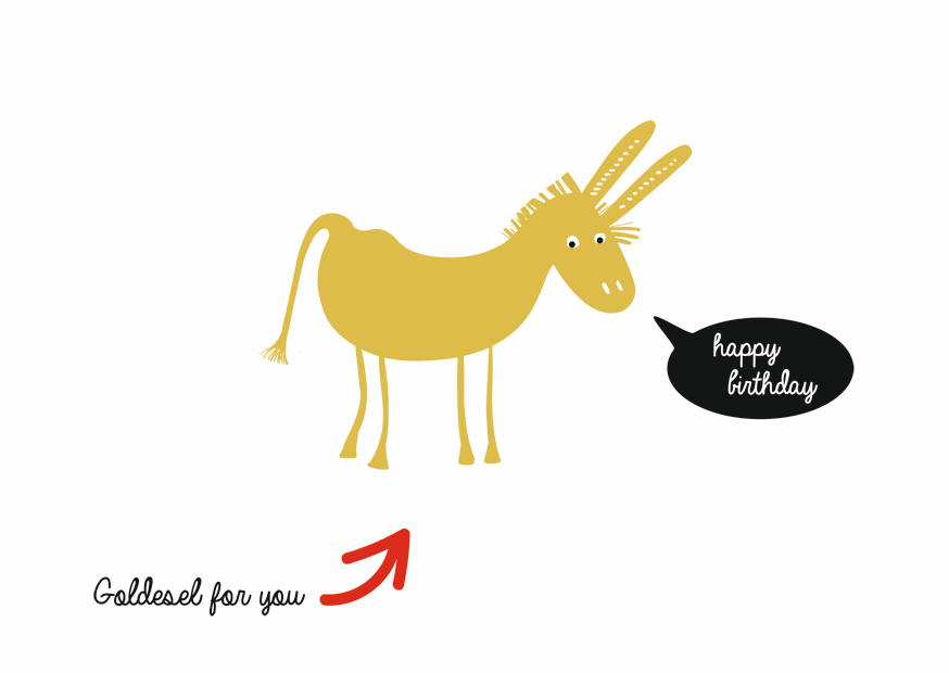 Ein einfacher, stilisierter Esel steht lächelnd da und spricht die Worte Happy Birthday, um Geburtstagsfreude zu verbreiten.