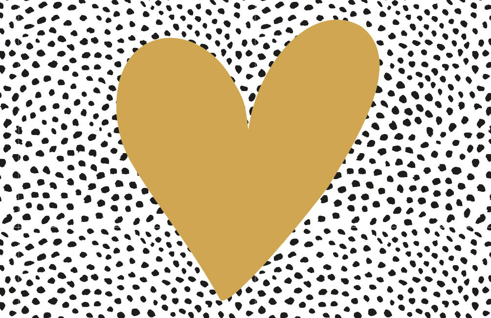 Eine kreative Darstellung eines goldenen Herzens in der Mitte eines schwarz-weißen gepunkteten Musters, das ein modernes, fröhliches Ambiente vermittelt.