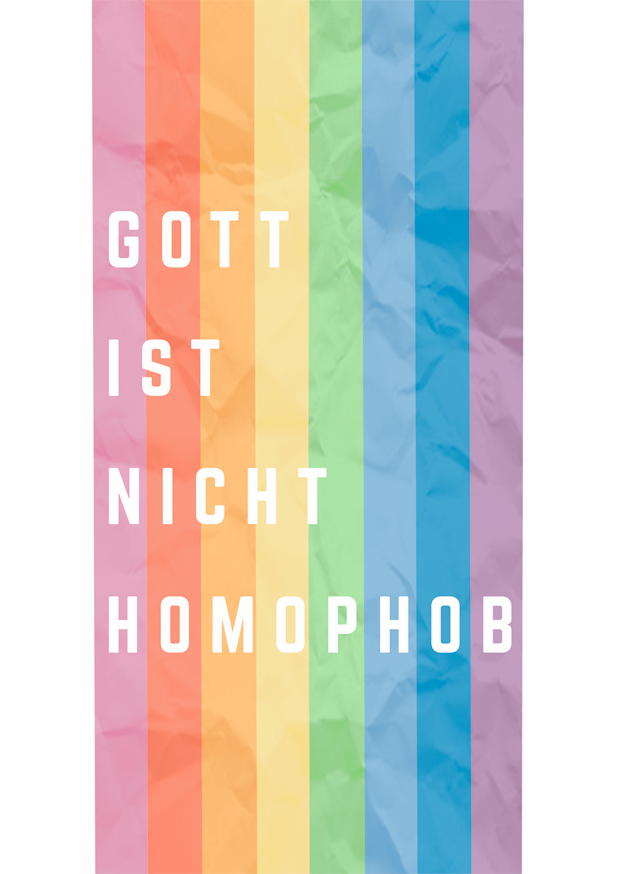 Ein farbenfrohes Banner zeigt die Botschaft Gott ist nicht homophob und wird zur Unterstützung der LGBTQ+-Bewegung bei einer Veranstaltung verwendet, um Toleranz zu fördern.