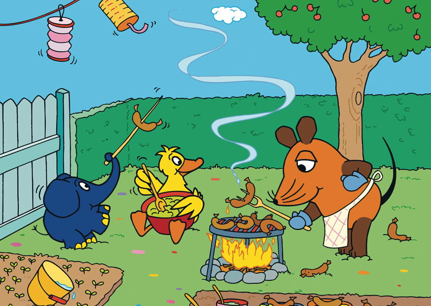 Im Garten bereit die Maus ein fröhliches Grillfest vor, während sie gemeinsam Würstchen am Grill zubereiten und das schöne Wetter genießen.