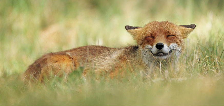 Ein entspannter Fuchs liegt im hohen Gras und genießt die warmen Sonnenstrahlen. Sein Gesicht strahlt Zufriedenheit aus, während die Natur ihn umgibt.