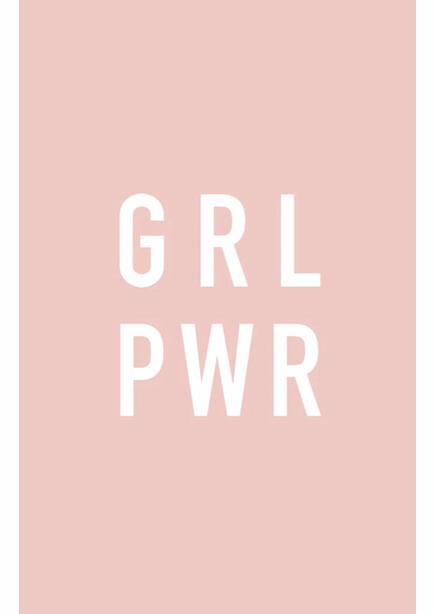 Diese Grafik zeigt den kraftvollen Slogan GRL PWR in klarer, weißer Schrift auf einem zarten rosa Hintergrund, der Selbstbewusstsein und Frauenstärke symbolisiert.