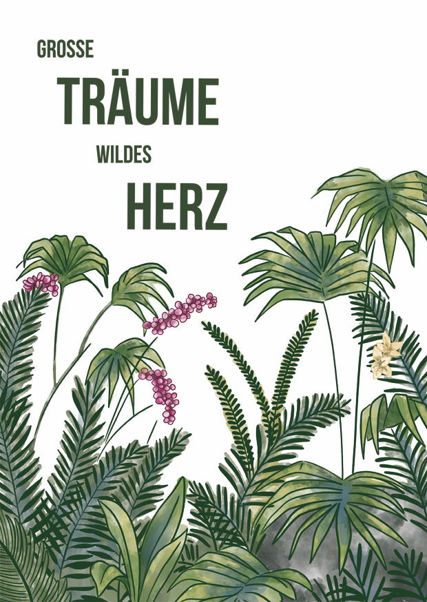 In einem üppigen Dschungel stehen Pflanzen und Farne im Vordergrund, während der Spruch „Große Träume, wildes Herz“ für Inspiration sorgt. Eine harmonische Komposition aus Natur und Text.