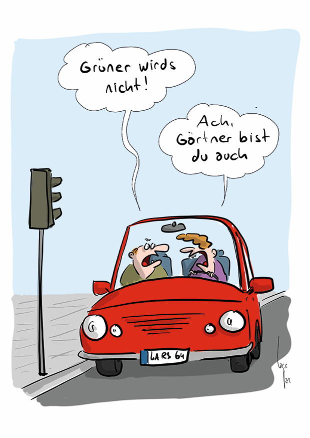 Im roten Auto warten zwei Personen an einer Ampel. Der Fahrer ist genervt wegen der langen Rotphase und der Beifahrer macht eine sarkastische Bemerkung über den Wartezeit.