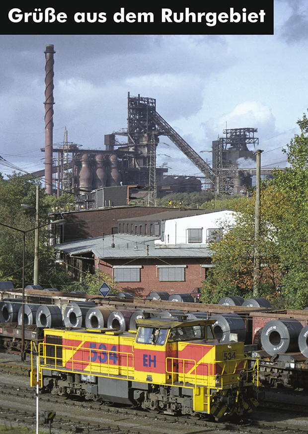Eine farbenfrohe Lokomotive steht im Vordergrund und zieht einen Zug mit Stahlrollen entlang einer Industrieanlage im Ruhrgebiet an einem bewölkten Morgen.