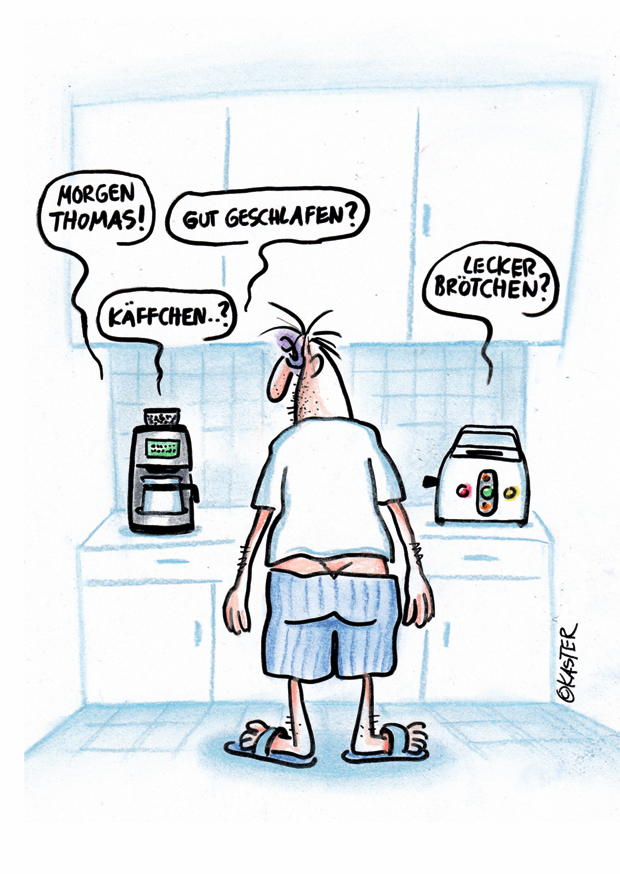 Ein Mann mit Schlafanzug und Pantoffeln steht morgens in einer hellen Küche. Er spricht mit seiner Kaffeemaschine und dem Toaster, die Fragen stellen.