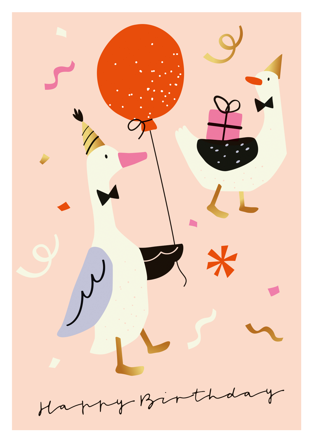Zwei dekorierte Enten halten einen orangefarbenen Luftballon und Geschenke in einer fröhlichen, festlichen Atmosphäre mit Konfetti und Feiermaterialien.