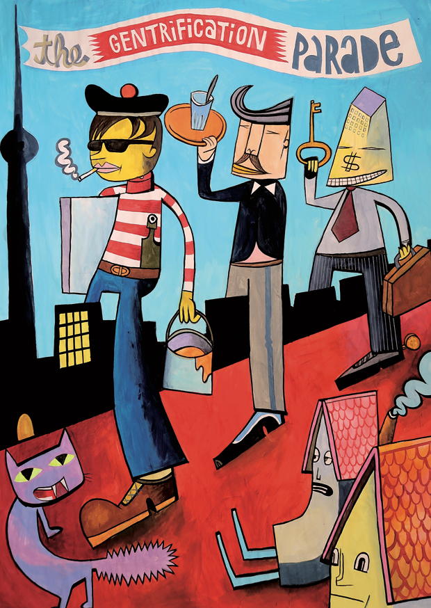 In dieser lebendigen Darstellung ziehen stilisierte Figuren durch eine städtische Kulisse.