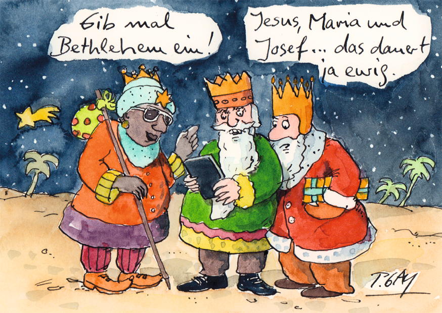 Drei Könige stehen in der Wüste und diskutieren eifrig über ihren Weg nach Bethlehem, während die Sterne am Nachthimmel funkeln.