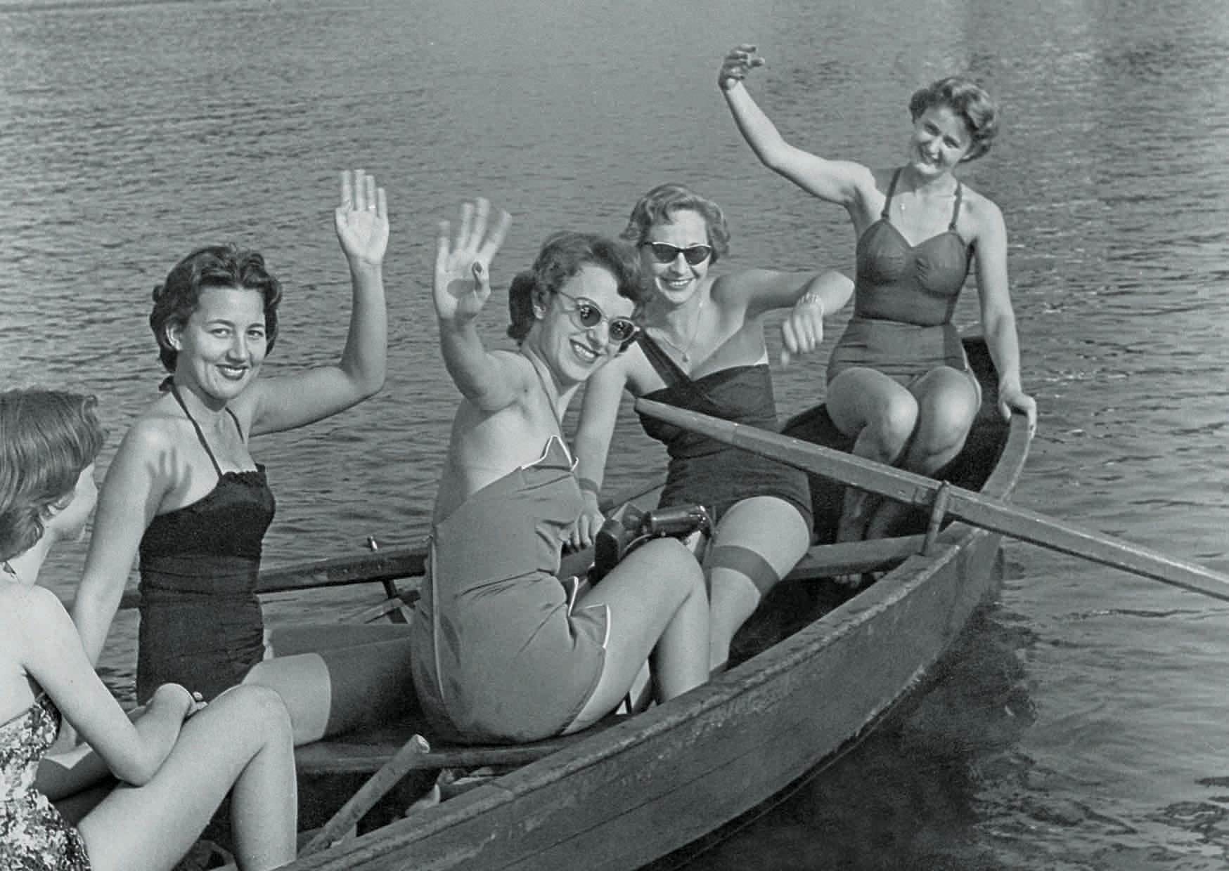 Fünf Frauen in Badeanzügen genießen einen Ausflug auf einem kleinen Boot und winken fröhlich in die Kamera. Es ist ein sonniger Tag am Wasser.