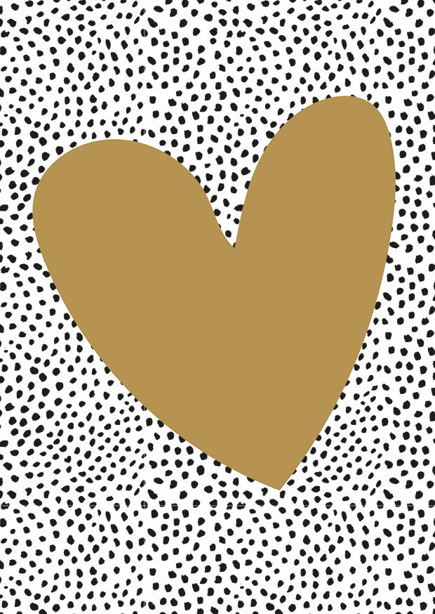 Ein großes, goldenes Herz liegt auf einem dynamischen Hintergrund, der aus vielen kleinen, schwarzen Punkten auf weißem Grund besteht. Die Kombination wirkt modern und einladend.