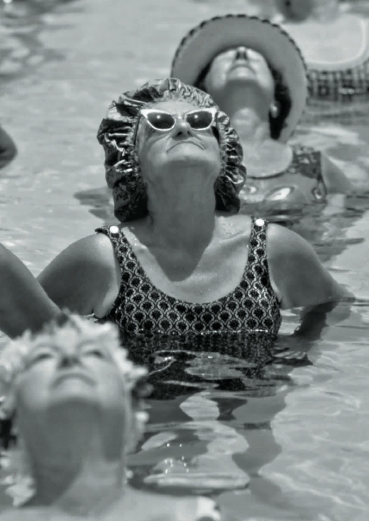 Gruppenschwimmen von Frauen im Pool. Die Damen tragen bunte Badeanzüge, einige haben Sonnenbrillen und Bademützen auf. Es ist ein entspannter Sommertag voller Freude.