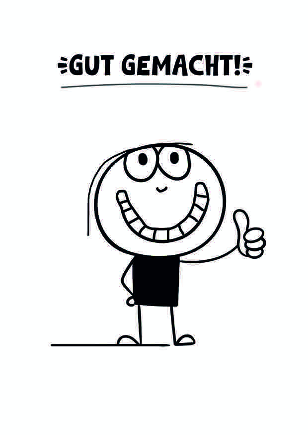 Ein fröhlicher, cartoonartiger Charakter mit einem breiten Lächeln und Daumen hoch drückt seine Freude aus. Der Hintergrund ist einfach und verstärkt die positive Botschaft.