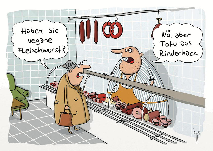 Eine ältere Dame fragt im Fleischerladen nach veganer Fleischwurst, während der Metzger überrascht mit Tofu aus Rinderhack antwortet.