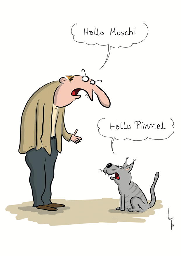 Ein Mann spricht mit seiner Katze, während sie sich in einem Raum befinden. Beide verwenden humorvoll ihre ungewöhnlichen Namen in der Unterhaltung.