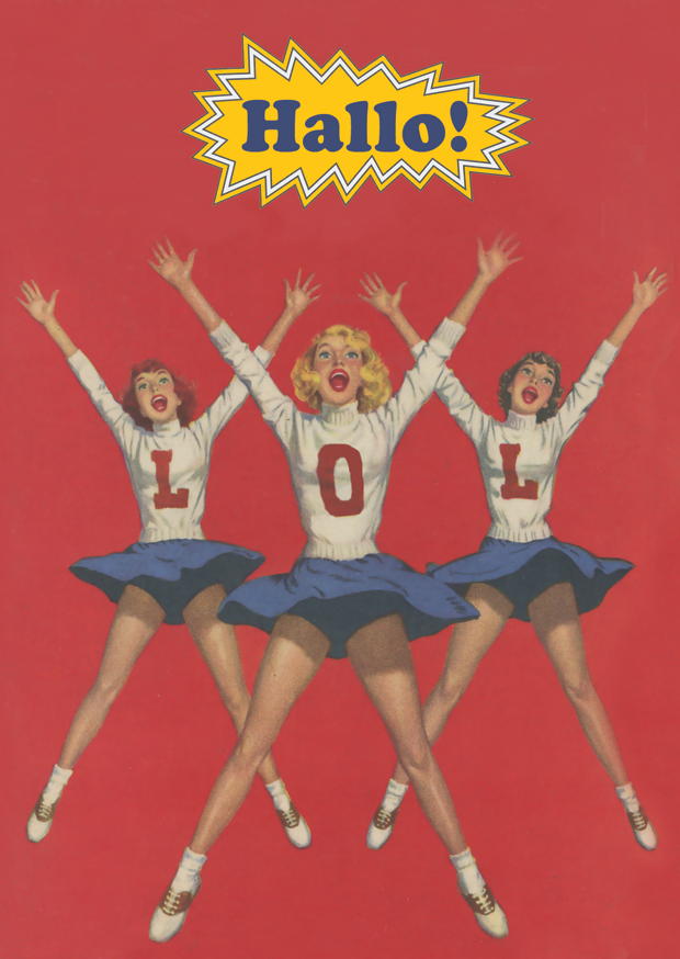 Drei Cheerleader in farbenfrohen Kostümen treten synchron vor einem leuchtend roten Hintergrund auf und zeigen ihre Begeisterung mit jubelnden Gesten und Lächeln.
